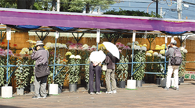 菊花展には、秦野菊花会(飯塚和彦会長・31人)のメンバーが盆養の部・切り花の部に約150点を出品。社団法人全日本菊花連盟公認審査員による審査が10月31日に行われ、全体的なつくりや花の大きさ、形などが規格通りか調べられた。