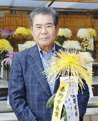 第59回秦野市文化祭の一環で行われている「第35回秦野菊花展」で、鈴木一郎さん(75・ひばりヶ丘)が出品した菊が切り花の部で、最高賞にあたる秦野市長賞を初受賞した。