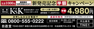 薄毛を研究する自遊堂(大和市中央林間)は、12月1日から男性用育毛剤「K,sk(ケースケ)」の販売を開始した。同社は年齢を重ねると毛根の発毛エネルギーが不足することに着目。もともと体に存在する生体成分「アデノシン3リン酸2ナトリウム」を配合し、直接毛母細胞に働きかけることで、発毛を促進するという。さらに、3種類の「男性ホルモン活性阻害成分」も入っており、頭皮や細胞が抵抗しないよう低刺激性にも配慮。「育毛効果と皮膚への安全性の両立を目指したハイブリッド育毛剤です。女性もご利用いただけます」と同社。