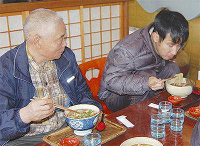 寺山の手打ちそば石庄庵(石井貞男社長)で12月9日、地域作業所かがやき(渡辺徳男所長)の利用者に、新そばが振る舞われた。