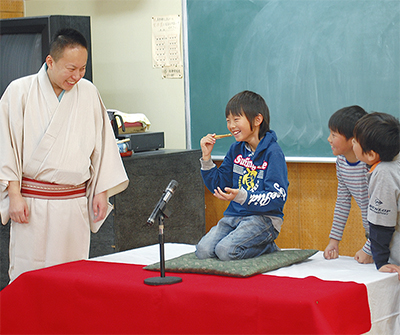 続いて、扇子を箸のように持ちそばをすすったり、手ぬぐいを焼き芋にみたてて食べたりする身振りを実演。希望した児童を高座にあげて、「目線が大事だよ」「それじゃあ、そばがこぼれちゃうよ」などとアドバイス。友だちがみせる熱演に教室は笑いに包まれた。