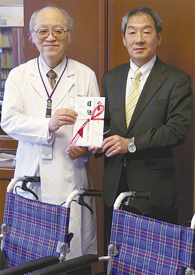 (株)トープラ(原章一代表取締役社長)=本社・秦野市曽屋201=の高橋和夫執行役員らが12月25日、秦野赤十字病院を訪れ、車いす2台を寄付した。高木繁治院長は「病院は地域の皆さんのご厚意で成り立っています。とてもありがたい」と話し、感謝状を手渡した。