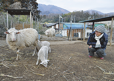 「ヴェ〜、ヴェ〜」と丹沢山塊にこだまする羊の声。5頭の羊と一緒に暮らすのは、秦野市堀山下・堀西地区で「やまやま農園」を営む杉本学さん(41)・美佳子さん(42)夫婦だ。美佳子さんは、刈り取った羊毛を自身の畑の植物を主に使用して草木染めをし、昔ながらの紡ぎ車で糸を紡ぎ、帽子やフェルト細工を手作りしている。