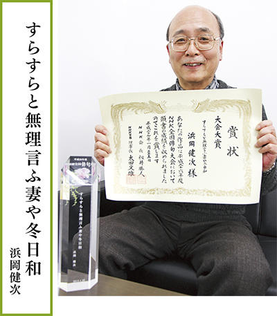 「すらすらと無理言ふ妻や冬日和」。大賞受賞の句は冬の中でも暖かく穏やかな日、妻・洋子さんと散歩中、浜岡さんが切り出した他愛もない相談に「そんなのこうすればいいじゃない」とさらりと言い「おいおい、簡単に言ってくれるなよ」という心情、情景を詠んだ。