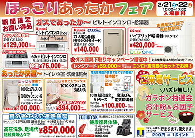 住まいの頼れるパートナー「みどりや」では2月21日(土)・22日(日)、お得いっぱいイベント「ほっこりあったかフェア」を開催する。入場無料で、時間は午前10時から午後5時。