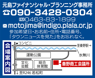 なぜか資産運用がうまくいかない方、必聴。多くの顧客を抱えるファイナンシャル・プランナー(FP)元島健二さん(商工会議所会員)が、金融機関では決して聞けない資産運用や損失解消法など、本来の安定運用ノウハウを分かりやすく解説するセミナー「お金が殖える仕組み創り(資産運用編)」が3月14日(土)に、秦野商工会議所3階会議室で開かれる。主催は(株)マネーコンサルティンググループとNPO法人日本FP普及協議会。セミナー参加特典として無料個別相談にも応じる。時間は午後1時〜3時。定員は15人。参加希望者は電話またはメールで申し込みを(FAXも可)。