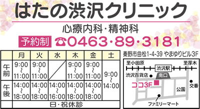 同クリニックは同じ法人である秦野病院と連携が密で、同院での入院治療のほかケアセンター(デイケア・就労移行支援・通所介護)などへの紹介も可能。1月からは週6日開院となり、受け入れ体制も万全だ。「地域のお役に立てれば」と八木院長。事前予約制のため、お問い合わせは左記へ。
