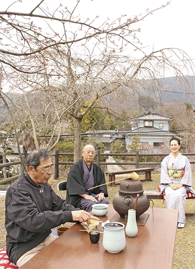 3月14日には緑水庵の庭で、初めて外での練習会を行った。1、2分ほど咲いた桜の木の下で、机の上で行う「立礼(りゅうれい)」を実施。参加した会員たちは「室内でした時と勝手が違う」と難しさを口にしつつも、自然の中での一連の所作や点てた茶を味わっていた。丸山さんも「お互いを敬う心を身につけ、前向きに楽しんでもらえたら」と微笑んだ。