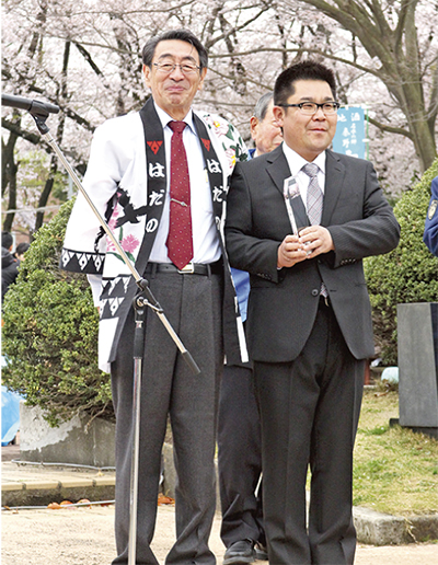 県内一の長さを誇る桜並木「はだの桜みち」。この愛称を名付けた矢部慎一さん(43・戸川)が、4月4日に行われた第32回秦野桜まつりのオープニングセレモニーで賞品を贈呈された。