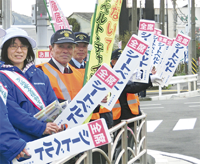 秦野市交通安全対策協議会が「4月10日シートベルトの日」に合わせて4月9日、国道246号線の堀川入口交差点で交通安全キャンペーンを行った。