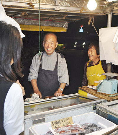 声の主は、三浦市から40年以上通い続け鮮魚の行商をしている「魚竜」の主人村松一雄さん(82)。その隣で、あうんの呼吸で手伝っているのは妻の登志子さん(75)だ。