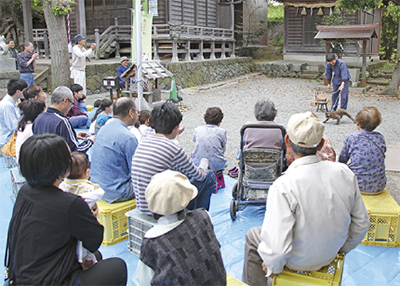 拠点である山口県岩国市を出発し、大型連休中に震災の被災地・福島県へ慰問を兼ねて巡る途中、同座座長の村崎修二さんの30年来の友人である高橋隆博さん(西大竹)の勧めもあり、休憩がてら秦野に立ち寄り、古来より続く伝統芸能を披露した。