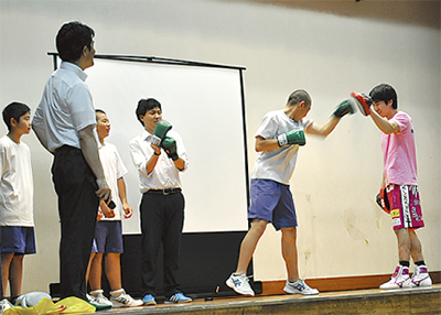 この日、同ジムの黒田雅之選手も出席し、講演後に模擬スパーリングを披露。生徒に体験者を募ると4人がすぐに手を挙げ、ミット打ちをした。中にはボクシング教室に通う生徒もおり新田さんが驚く程の動きを見せ会場は盛り上がった。
