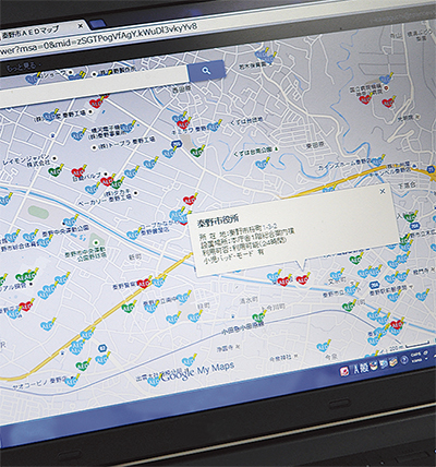 AEDマップ作成にあたり今年4月、同認定施設に現状調査票を郵送。あわせて、認定を受けずにAEDを所有している施設には、同本部職員が出向き調査票への記入説明等を行った。