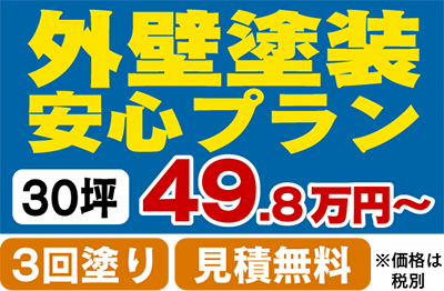 施工費は外壁塗装安心プランが49・8万円(税別)〜(3回塗り・30坪の場合)。診断・説明・仮設工事・塗装工事・アフターサービスをすべて含んだお値段で、見積は無料。壁の質や耐候性等によって種類の異なる塗料を使い分けてくれるという。「まずはお悩みやご要望をお聞かせ下さい。最適な施工法をご提案させていただきます」。