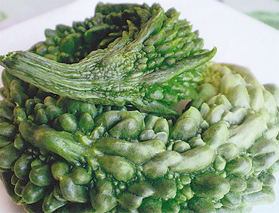 岡村真さん・文子さん夫妻(秦野市下大槻在住)宅で7月10日、ユニークな形のゴーヤが収穫された。