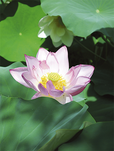秦野市寺山のそば店「石庄庵」の池で、ピンク色の大賀ハスが可憐な花を咲かせている。大賀ハスは2千年前の地層から発見された種から栽培され「古代ハス」とも呼ばれる。