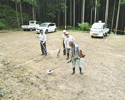 作業が始まったのは7月下旬。「地元の地権者に事情を話し、駐車場の隣の土地を無償で借りることができた」と高梨組合長。市森林づくり課から資材の提供を受け、草刈り機などの機材はメンバーらが持参して、草木を除去した。地面をならし、線引きをして、15台分の駐車スペースを増設。既設の駐車場にも砂利を敷き、整備を行った。同組合と同会のメンバー10人がボランティアで作業を続け、3週間ほどで完成した。