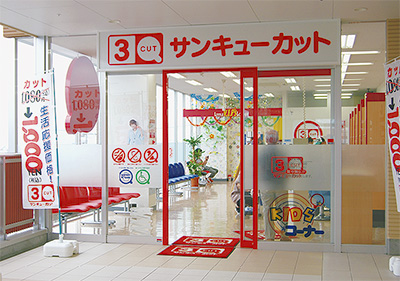 ヤオコー秦野店2階、赤と白の清潔感溢れる店舗「3Qカット」。値段は髪の長さに関わらず一律1000円(税込)だけ。10分以上かかるスタイルも追加料金なし。そんな明快なサービスで人気を集め、全国280店舗を展開している。
