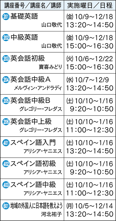 上智大学短期大学部が、秋期コミュニティ・カレッジの受講生を募集している。秦野キャンパスで、英語など10講座を開講。受講料は全10回2万600円、601番のみ全5回1万300円(いずれもテキスト・プリント代は含まない)。