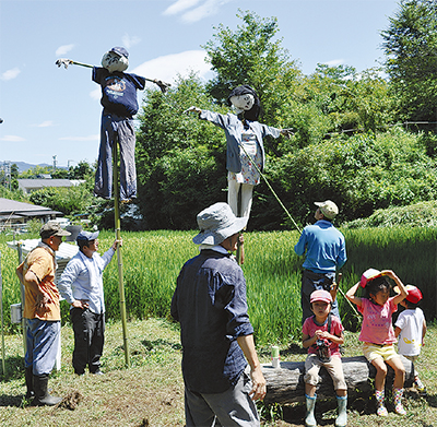 かかしを製作したのは、同里で保全活動等を行っている千村ネイチャー倶楽部(谷光清会長・29人)の会員。昨年栽培した米の藁を人形の形に整え、会員が持ち寄った洋服に着替えさせて完成。約4mの高さの竹にくくりつけた後、竹を組んでしっかりと固定した。