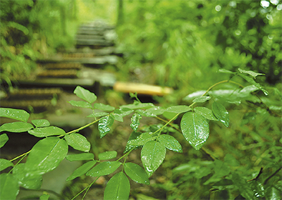9月を迎えた権現山へ続く山道。そぼ降る雨の中、ゆく夏を惜しむように、辺り一面から蝉の音が響く。日が照れば夏の気配がまだ残る上り坂を登れば、額に汗がにじみ出る。その一方、雨が降れば気温が下がり、秋の気配を感じるようになった。権現山はこれから秋の行楽シーズンを迎える。
