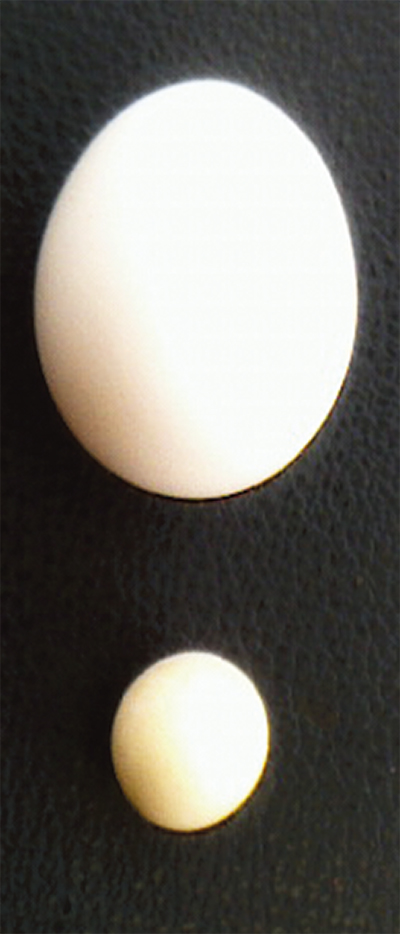 通常サイズの半分以下、長径約2cmという小さなたまごを千村在住の小野薫さん(59)宅のチャボが産んだ。