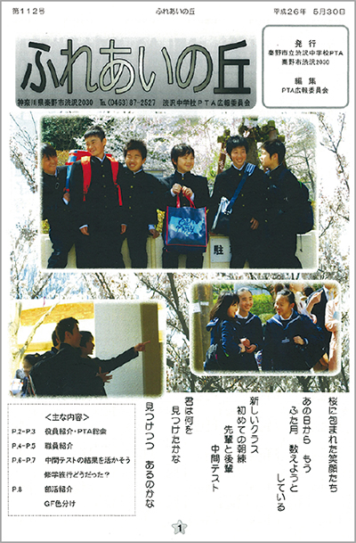 「ふれあいの丘」は、3カ月に1度ほどのペースで発行。行事や学校生活での生徒の表情を捉えた写真が表紙を飾り、その下に保護者の目線で書かれた短い詩が添えられている。内容は、携帯・スマートフォンと子どもたちの付き合い方についてアンケートを集計した特集企画や、職場体験に関する取材記事など「保護者が気になる話題」に切り込んでいくものが多かった。