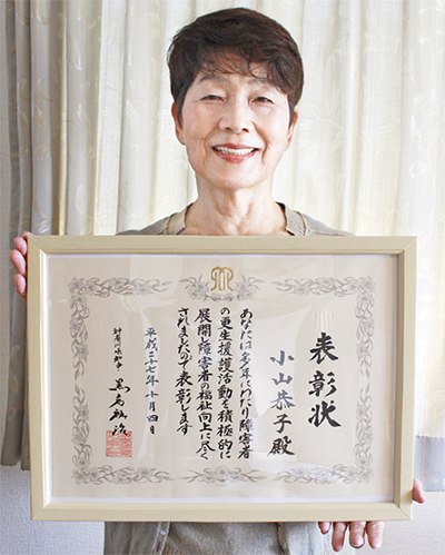 神奈川県は9月30日、2015年度神奈川県障害者自立更生者・更生援護功労者を発表。秦野市では小山恭子さん(67・戸川在住)が更生援護功労者に選ばれ、10月4日に行われた表彰式(座間市)で知事表彰を受けた。今年の受賞者は県内で6人。