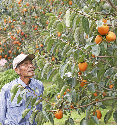 「こんなにたくさん実ったのは初めて」。収穫期を迎え、たわわに実った百目柿(ひゃくめがき)の木を見上げて、菩提の農家・山口博さん(81)は顔をほころばせる。