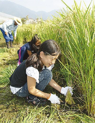 戸川三屋鎮守の里を育む会(桐山清会長)の10月24日、戸川の田んぼで稲刈りを行った。当日は同会の会員18人と戸川西子供会の会員と保護者11人が参加。朝9時から昼頃まで、参加者らは鎌で一束ずつ稲を刈り、もち米を収穫した。子ども達は育む会の会員や保護者らに教わりながら、稲刈りを楽しんでいた。