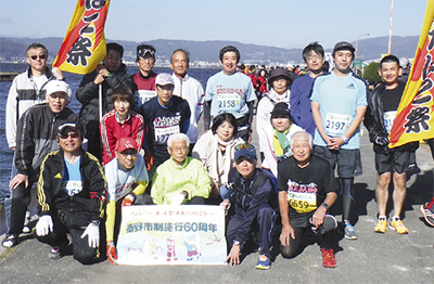 湖畔コースを1周する「第27回諏訪湖マラソン」が10月25日、長野県諏訪市の諏訪湖畔で開かれ、秦野市から「諏訪湖マラソンを走る会」のランナーらが出場した。