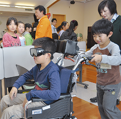 参加者らは午後からは社会福祉法人寿徳会が運営する、特別養護老人ホーム松寿苑へ移動。昼食後、同施設の職員の解説を聞きながら、白内障などを患った高齢者の視覚を再現できる特殊なゴーグルを付けて、車いすに座り高齢者体験をした。2人1組になり、細い道や曲がり角、デコボコの段差を付けたコースを車いすを押して巡った。高齢者の体験をした子どもは「ゴーグルを付けるとぼんやりとしか見えなくなって怖かった」と話し、車いすを押す役の子どもの1人は「段差を越えるのにとても力が必要だった。乗っている人を落とさないように気を付けなければいけないと感じた」などと感想を話した。