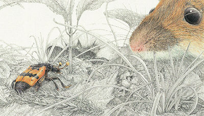 表題になっているシデムシは動物の腐肉などを食べる甲虫。漢字で「死出虫」と書く。同作に登場するヨツボシモンシデムシは秦野市内の山林にも生息しており、ネズミや小鳥など小型の脊椎動物の死骸を丸めて肉団子にし、その上で子育てをする。死体を土に還す役割を担う、いわば「森のおそうじ屋さん」だ。この絵本では、そんなシデムシやアカネズミが関わり合いながら懸命に生き、死にゆく姿が淡々と、かつ丁寧に描かれている。