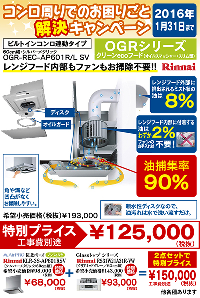 お掃除不要という、話題のリンナイ製レンジフード「OGRシリーズ」を特別価格で販売する(2016年1月末まで)。