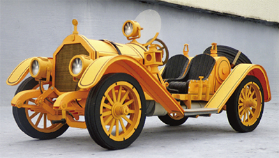 趣味としても数々の作品を生み出してきた。モチーフの多くは、クラシックカーやバイクなど乗り物だ。タイヤや配線、滑らかな曲線を描くボディまで、全て設計図から自作。お気に入りの素材は、「マーメイド」という表面に凹凸がある色の着いた紙。表面だけでなく紙自体が着色してあるため切断面が白くならず、でこぼこした表面が独特の風合いと温もりを感じさせるという。梶原さんは作品を眺めながら、「細部まで本物に近づける事がこだわりです」と笑う。