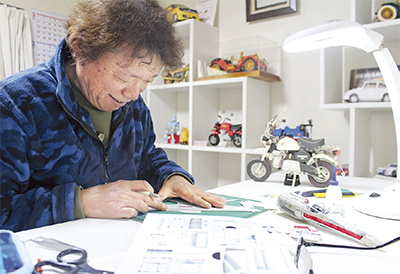 伊勢原市にあるアパートの一室に、F1レーシングカーや機関車、クラシックカーや飛行機など、精巧に作られた立体模型が飾られている。それらは全て、紙を素材として作られたペーパークラフト。制作したのは、秦野市南矢名在住の梶原三喜男さん(60)だ。