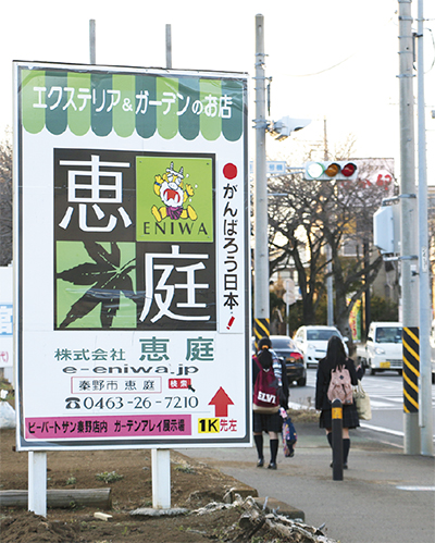 秦野市の小原台交差点近くにある屋外看板。その一部が定期的に変わることに気付いている人は少ないのでは。4つ並ぶ正方形の右上の1枚だけが季節ごとに変わる。看板の設置主は、外構や造園を手掛ける株式会社恵庭(えにわ)(秦野市南矢名)。