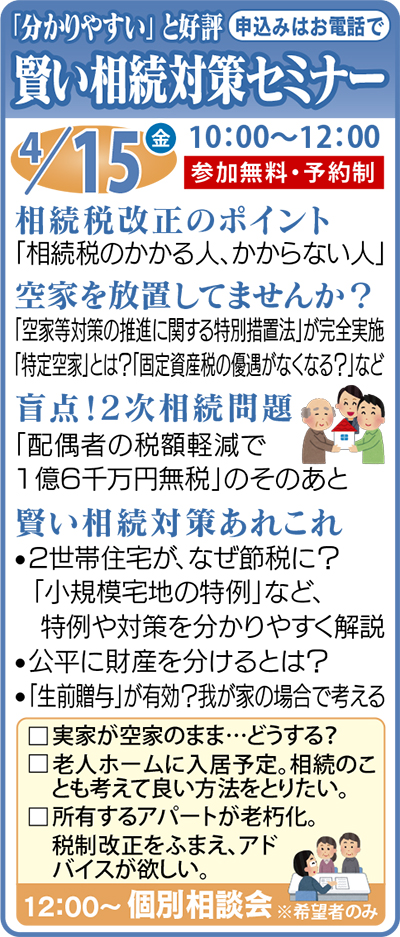 セミナーでは相続増税のポイントなどをやさしく解説するほか「相続した実家に住まない」「独立した子が戻るか未定だが、相続のことも考えて良い方法を」など身近な実例を取り上げ対策方法を多数紹介。役立つ情報も満載なので、ぜひ参加を。