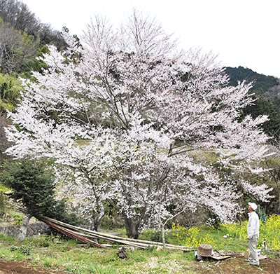 日本三大桜にも数えられる岐阜県根尾谷の「淡墨(うすずみ)桜」の子孫の樹が、猪股義晴さん宅(秦野市蓑毛453)で見頃を迎えている。