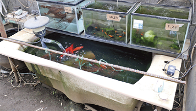 秦野市平沢在住の柳川浩正さん(75)は、趣味で金魚を繁殖させて、毎年7月に開かれる南町自治会の納涼祭の金魚すくいに提供している。庭先には、近所の人にもらった瓶や、トビ職時代に現場で引き取った浴槽などを有効活用した10個の「水槽」がずらり。柳川さんは「小さな金魚は可愛い。けんかをしているのも面白いんだよ」と話す。
