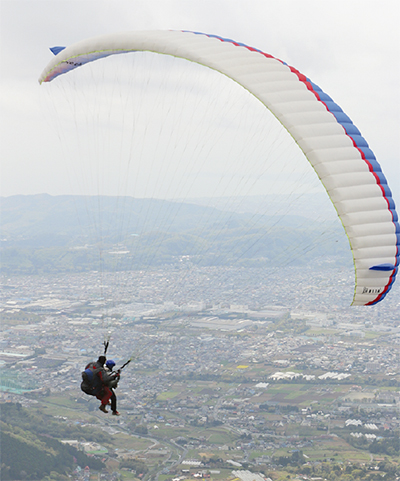 秦野市菩提峠・丹沢表尾根付近で活動するハンググライダー・パラグライダー同好会、丹沢スカイクラブ(佐藤恵三会長・70人)が、市内の初心者等を対象に、パイロットと一緒に飛ぶ「タンデムフライト」の体験会を定期的に開いている。