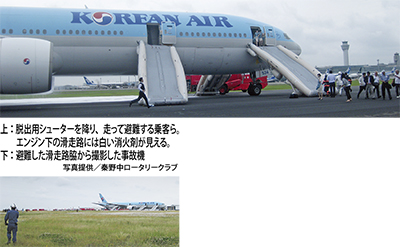 5月27日、羽田空港を離陸直前に左翼エンジンから出火し、一時滑走路が閉鎖されるなど大きな影響が出た大韓航空機の火災事故。この機体に秦野中ロータリークラブ(RC)の12人が乗り合わせていた。