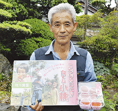 昨年は豊作だったが、今年は気候が不安定で収穫量は10分の1程度。しかし、甘みは十分だという。出荷しているモモのパッケージには『こもものじじが育てた小桃』と書いたシールでひと工夫。同じ頃に生まれた孫の名前が偶然「こもも」であったことからつけた名前だ。「孫が自分の作ったモモをおいしいと食べてくれる笑顔が元気の源です」と話した。同会で生産しているモモは、はだのじばさんずで購入できる。
