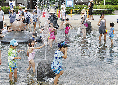 3連休の最終日、7月18日の海の日は、水着に着替えた子どもたちが元気よく池にダイブ(=写真)。暑さを吹き飛ばすように”じゃぶじゃぶ”水しぶきをあげてはしゃいでいた。