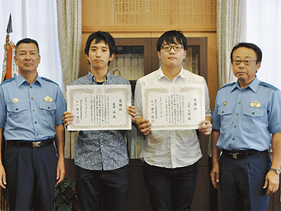 マクドナルド小田急秦野駅店で発生した強盗事件の容疑者逮捕に協力したとして、秦野警察署(横山俊二署長)は8月10日、同店アルバイトの上村幸徳さん(23・東海大学4年)と臺(だい)原誠さん(22・同)に感謝状を贈った。