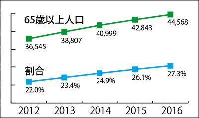 8月末日現在、市内の65歳以上の人口は4万4568人(総人口における割合27・3%)。2015年は4万2843人(同26・1%)、14年は4万999人(同24・9%)、13年は3万8807人(同23・4%)、12年は3万6545人(同22・0%)と、毎年2000人近く増えている。また総人口に対する割合は毎年1ポイント以上上昇、高齢化が進んでいる。現在市内では4人に1人が65歳以上という換算になる。