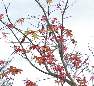 「ちょっとだけ残念なのはあれかな」。ほほ笑む目線の先には、高さ3mほどのイロハモミジ。毎年10月初旬には真っ赤に色づくはずの葉はまばらで、枝に20個ほどのミノムシが秋空を背景に連なっている。「これも、この地域の自然が豊かな証拠。無事に冬を越えてもらいたい」と話した。