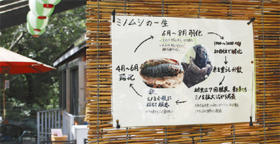 現在、店の周りでは、みのから上半身を出してちょこちょこと枝の上を移動する姿も見られ、都心からの来店者や子どもたちが珍しがって眺めているという。質問も多く寄せられることから、石井社長が手作りした「ミノムシの一生」の解説を店先に掲示している。