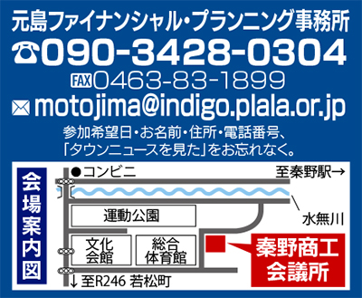 「相続・贈与の要点がわかります」。多くの相談を受けるファイナンシャルプランナー(FP)元島健二さん(商工会議所会員)が、他ではなかなか聞けない相続・贈与の注意点や有効策などを分かりやすく解説する「親子・夫婦で参加する!相続&贈与が基本からわかる実践セミナー」が、11月5日(土)に秦野商工会議所3階会議室で開催される。主催は(株)マネーコンサルティンググループ(http://money-cg.com/)とNPO法人日本FP普及協議会。セミナー参加特典として無料個別相談にも応じる。時間は13時〜15時。定員16名。参加希望者は電話・メール・FAXで申し込みを。